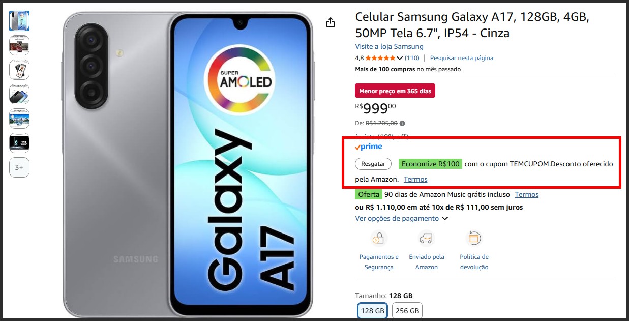 A Amazon liberou um novo cupom que garante R$100 de desconto em compras a partir de R$999, válido tanto no site quanto no aplicativo. A oferta pode ser usada com um único produto ou combinando vários itens elegíveis no carrinho, desde que atinjam o valor mínimo exigido.