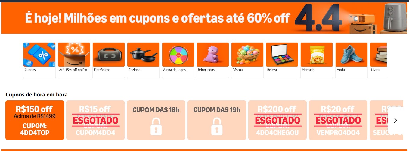 Se você estava esperando o momento certo pra economizar, ele chegou. O evento 4.4 da Amazon está liberando uma enxurrada de cupons com descontos que chegam a R$200 OFF, além de ofertas exclusivas em eletrônicos, notebooks, games e muito mais.