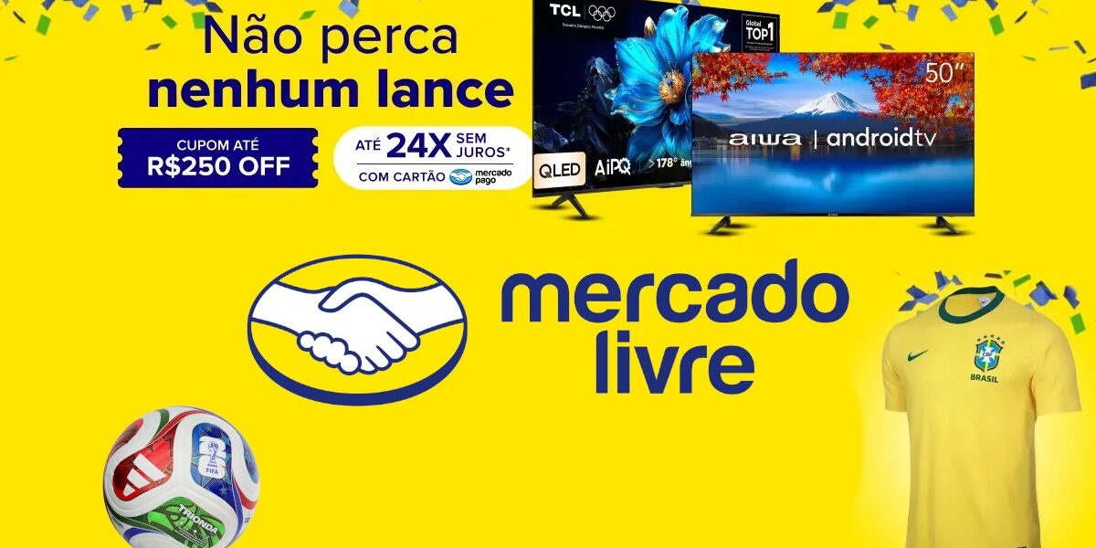 A Copa do Mundo FIFA 2026 está chegando e o Mercado Livre não quer que você fique de fora dessa festa. Em uma nova campanha temática, a plataforma liberou cupons agressivos que chegam a R$ 250 de desconto em produtos selecionados, com foco total em quem precisa de uma tela nova para acompanhar a Seleção Brasileira.