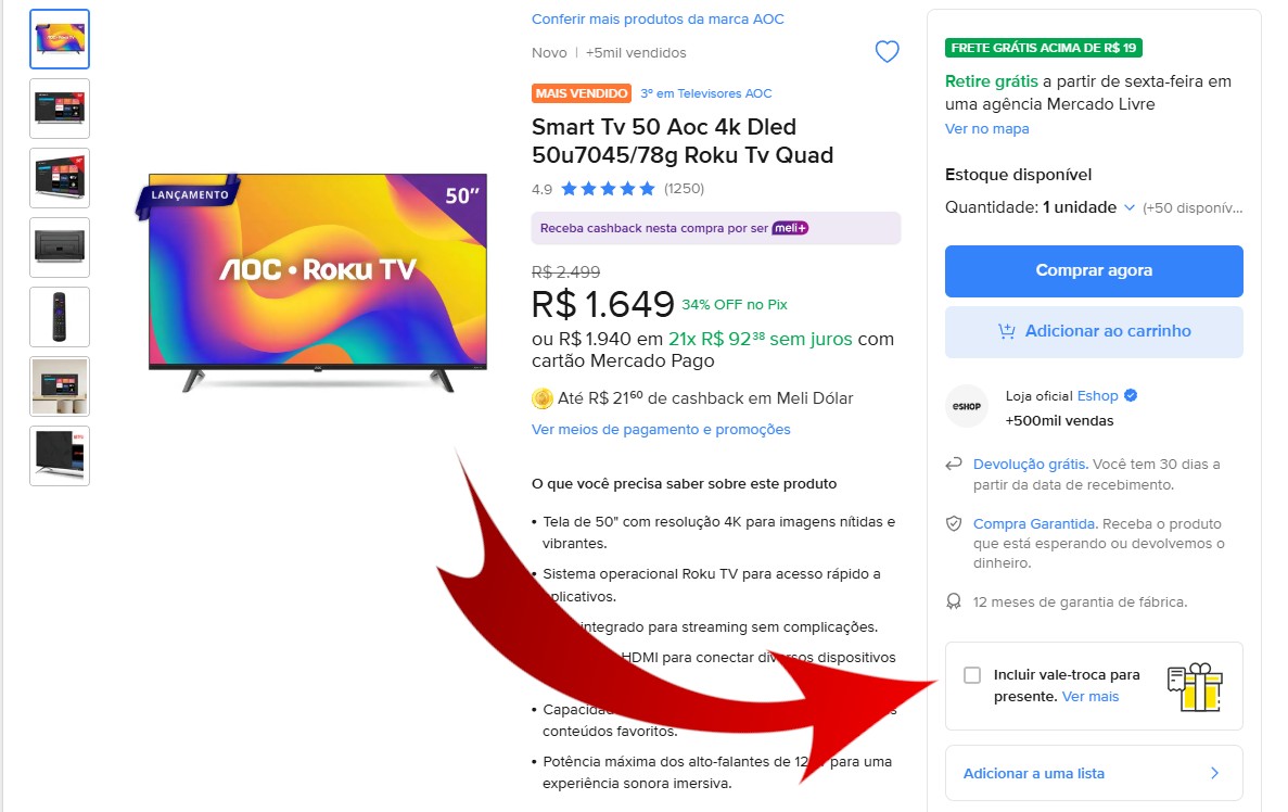 O Vale Troca funciona como um crédito gerado a partir do presente adquirido. No momento da compra, caso o produto seja elegível, o comprador pode adicionar a opção de vale antes de finalizar o pedido, na propria página do produto. Com isso, se o presenteado quiser trocar o item, não será necessário iniciar um processo de devolução tradicional. Em vez disso, ele receberá um crédito equivalente ao valor pago, podendo utilizá-lo na compra de qualquer produto disponível no Mercado Livre, sem restrições de categoria ou vendedor, porém em produtos elegiveis.