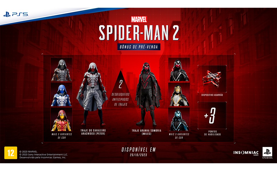 Mas espere, tem mais! A pré-venda deste incrível jogo também inclui bônus exclusivos que certamente aumentarão ainda mais sua empolgação. Você terá acesso ao desbloqueio antecipado do Traje do Cavaleiro Aracnídeo para Peter, com três variantes de cor, bem como o desbloqueio antecipado do Traje Aranha Sombria para Miles, também com três variantes de cor. Além disso, você receberá o desbloqueio antecipado do dispositivo Agarrão com Teia e mais 3 pontos de habilidade para turbinar sua jornada como super-herói.