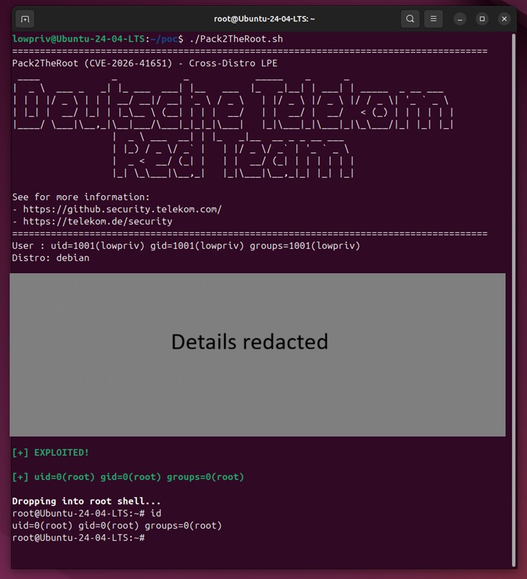 Red Team da Deutsche Telekom demonstra exploit de escalonamento de privilégios no Ubuntu 24.04 LTS. A transição para root expõe riscos críticos em sistemas desatualizados. Detalhes técnicos seguem confidenciais. (Imagem: GitHub – Telekom Security)